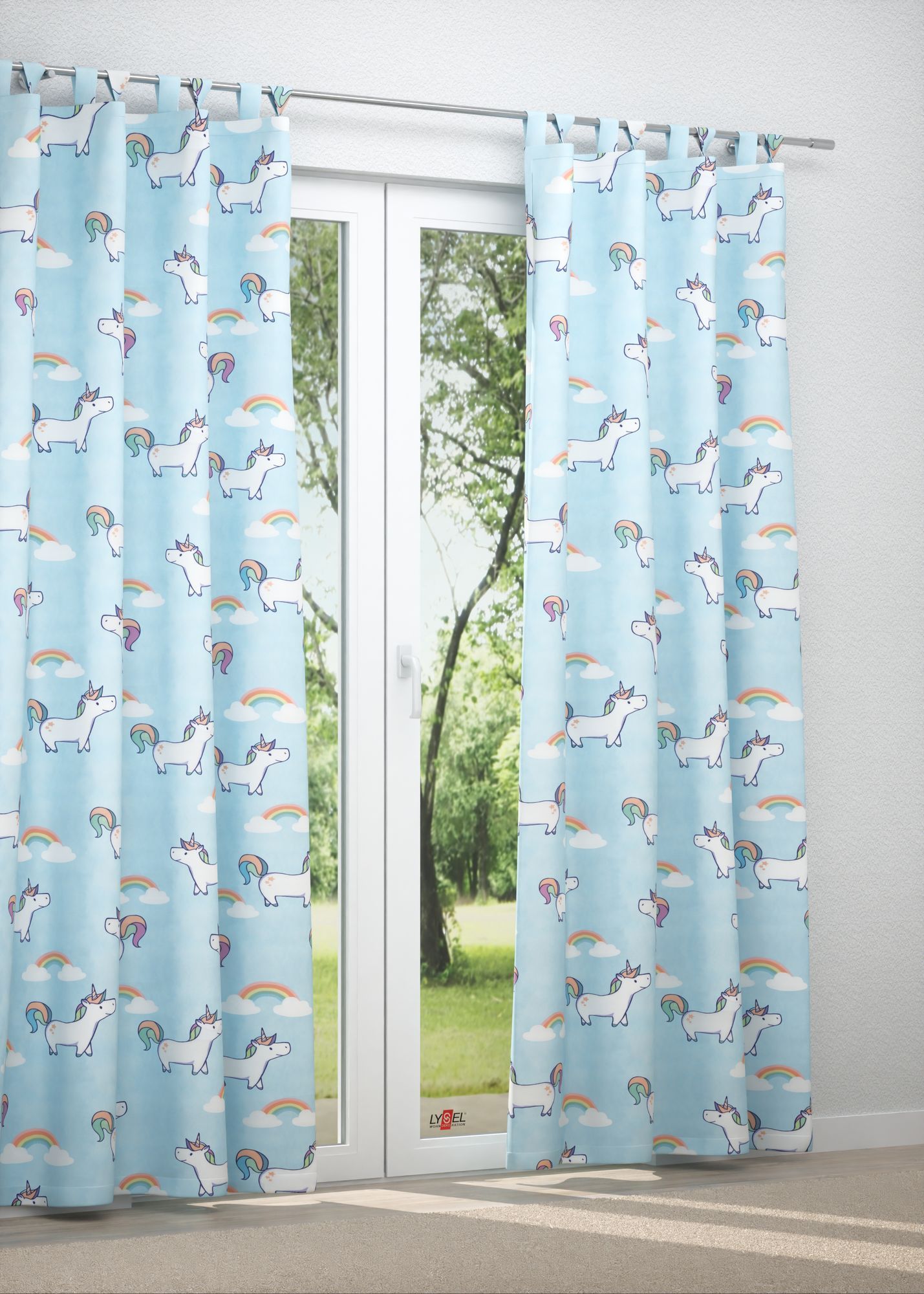 Dabei sind die Einhörner mit lilafarbenen Umrandungen und Schattierungen gestaltet, was sie noch magischer wirken lässt. Ihren Schweif und die Mähne präsentieren die Einhörner anmutig in den gedeckten Tönen Apricot, Himbeerrosa, Lindgrün und Pastellviolett. Die Farben des Regenbogens leuchten nochmal mehr. Eine Einrichtung in Blautönen, Weiß und Grau setzt das Design wirkungsvoll in Szene.