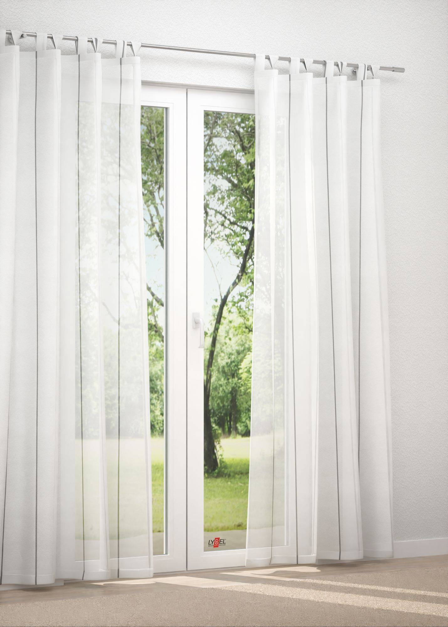 Das Zusammenspiel von leichtem, luftigem Gewebe und klaren Akzenten verleiht diesem Stoff einen modernen, zeitgemäßen Look. Das ruhige und klare Design in Form von schmalen, unterschiedlich gestalteten Streifen fügt sich in reduzierte Wohnumgebungen besonders gut ein. In einem bunt und abwechslungsreich dekorierten Raum kann ein Accessoire aus diesem Stoff für Ruhe und Ausgeglichenheit sorgen. Bei einer Fensterdeko unterstützt das am Rand eingefügte Bleiband einen schönen, gleichmäßigen Fall. Stellen Sie sich im Konfigurator Ihre Fensterdeko nach Maß je nach Wunsch zusammen. Neben den Abmessungen können Sie auch die Aufhängung und den unteren Abschluss gestalten. Aufgrund der Transparenz des Polyestergewebes eignet sich das Modell außerdem für Tischläufer und kleine Deckchen.