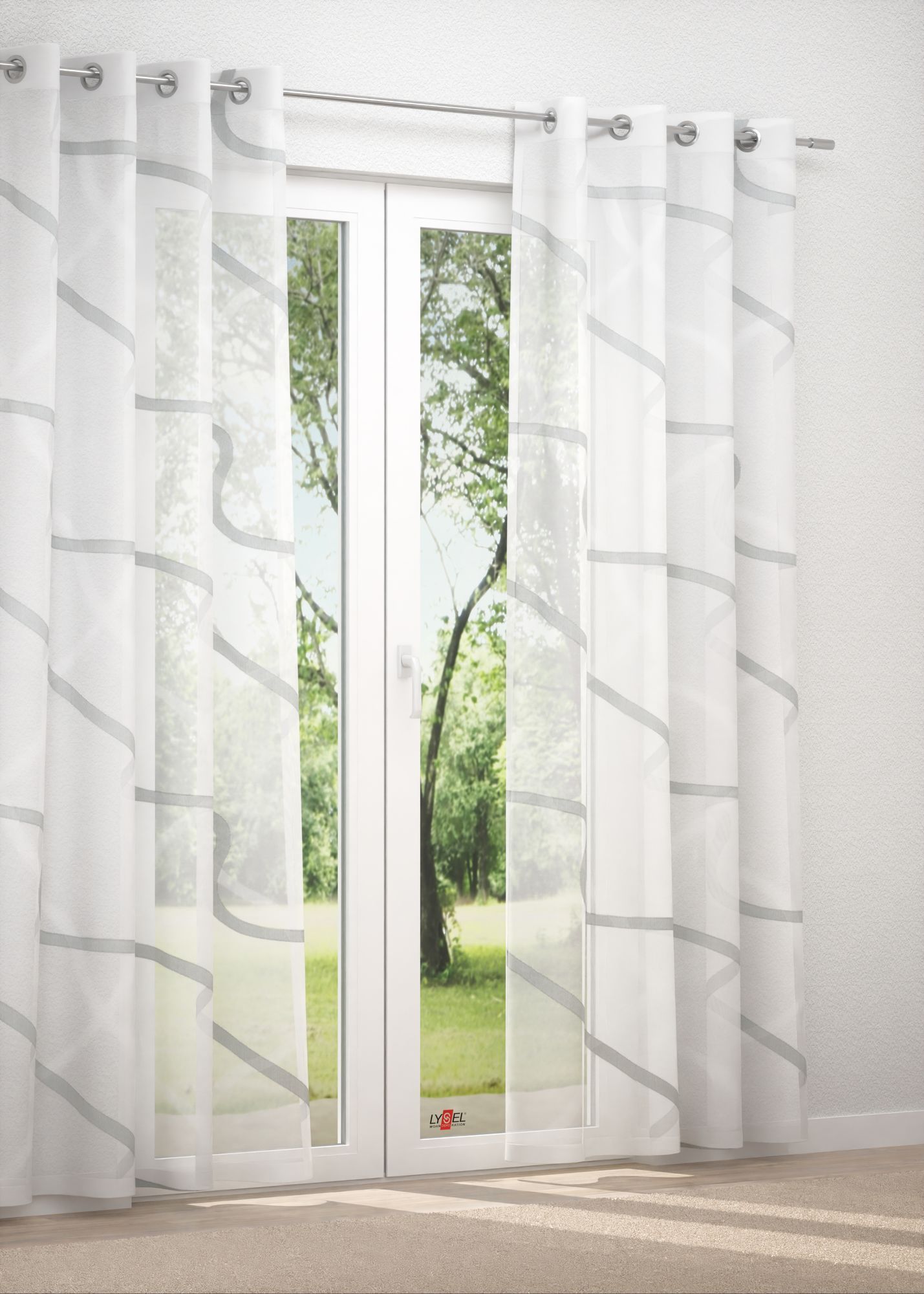 Das abstrakte Muster, das sich großflächig und dynamisch durch den gesamten Stoff zieht, wurde in Scherli-Technik eingefügt, die vor allem an den ausgefransten Rändern erkennbar ist. In den Grundstoff wurden die fein gestreiften, geschwungenen Linien, eingewebt. Diese treten hier durch die plastische Optik hervor und unterscheiden sich außerdem durch die dunklere Gestaltung von dem Hintergrund. Die Wirkung des Musters und die zarte Eleganz des durchsichtigen Gewebes kommen bei einer Fensterdeko besonders gut heraus. Diese können Sie beispielsweise als Raffrollo oder Gardinenschal nach Maß im Konfigurator zusammenstellen. Ziert der Stoff das Fenster, wirkt der Raum optisch größer, außerdem lichtdurchflutet und freundlich. Für Tischwäsche bietet sich der elegante Stoff ebenfalls an. Damit Sie eigene Deko-Ideen kreativ umsetzen können, können Sie diesen auch als Meterware bestellen.
