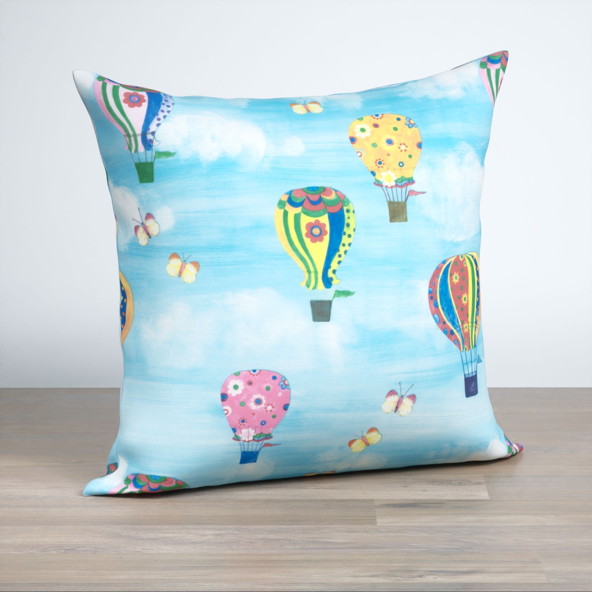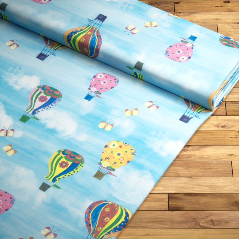 Ein erfrischendes Hellblau als Hintergrund liefert die Basis für das Motiv dieses Stoffes und nimmt auch den Großteil der Fläche ein. Die in bunten Farben, Grün, Gelb, Pink, Rot und Blau, gestalteten Heißluftballons kommen dadurch noch besser zur Geltung. Auch die Schmetterlinge in Orange- und Cremetönen sorgen für eine verspielte Leichtigkeit.