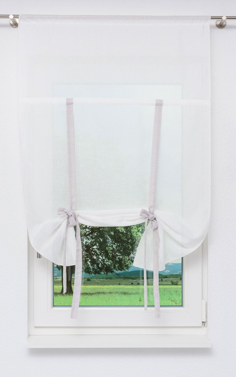 Dieses Bändchenrollo fällt tatsächlich zuerst durch die namensgebenden Bändchen auf, die sich hier dezent von dem Stoff abheben und links und rechts zu großen Schleifen gebunden werden können. Die Bändchen dienen der Raffung des Stoffes. Sie können also die Höhe individuell verändern, damit auch den Lichteinfall anpassen. Somit wirkt der Raum immer anders. Die leinenähnliche Struktur des Polyesterstoffes unterstreicht das vom Landhausstil inspirierte Design. Im oberen Drittel ist zudem ein Tunnel eingefügt, in welchen die Beschwerungsstange kommt und für einen optisch schönen Fall des Stoffes sorgt. Aufgehängt wird der Behang mittels Stangendurchzug wahlweise an einer Klemm- oder Gardinenstange, die Sie ebenfalls im Shop finden.